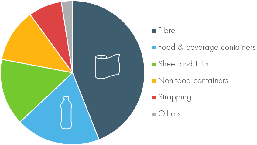Textile fibers:- Particular properties such as tensile strength, abrasion resistance and low moisture absorbing capacity, make the PET the most important raw material for manufacturing synthetics fibers. Textiles made of PET are crease resistant, weather resistant and fast drying, which makes them an excellent choice for manufacturing sports clothing- everyone can make a use of cozy polar fleece during winter time.